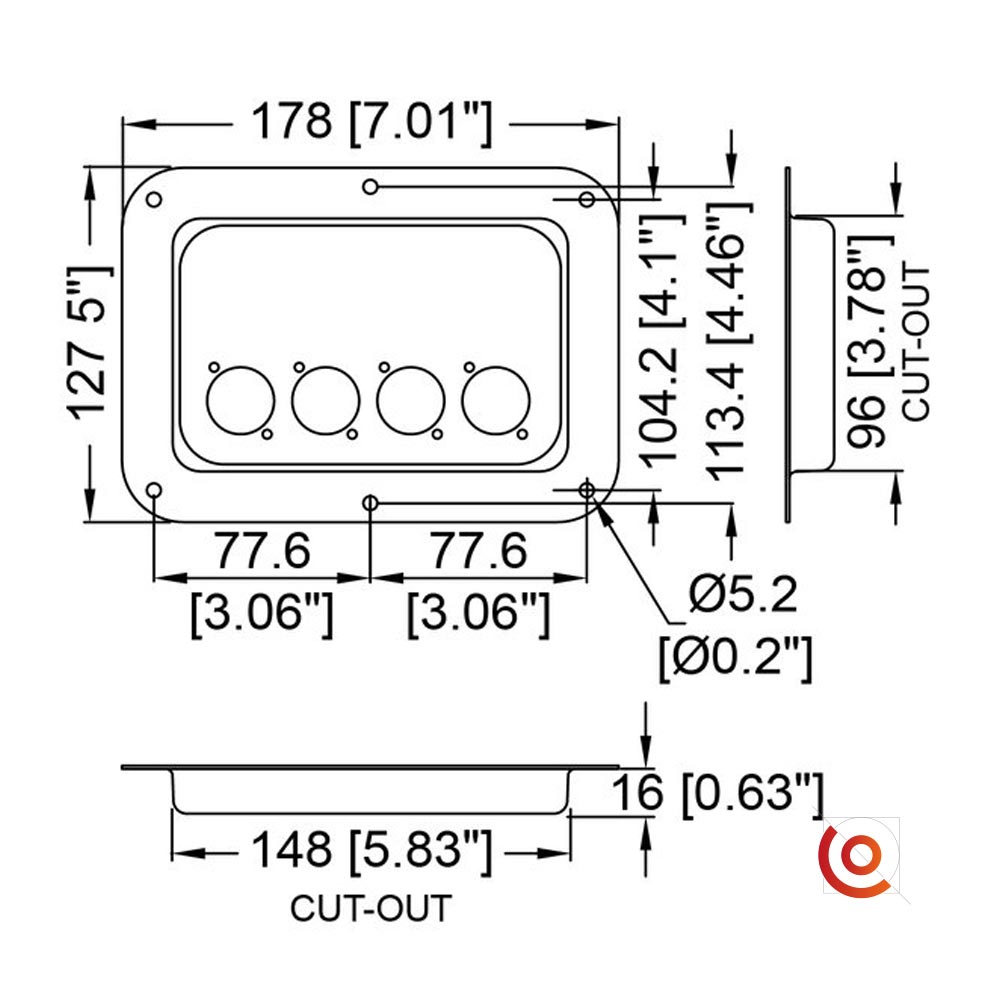 Cuvette métal acier pour 4 connecteurs neutrik afin d’équiper votre flight case.
