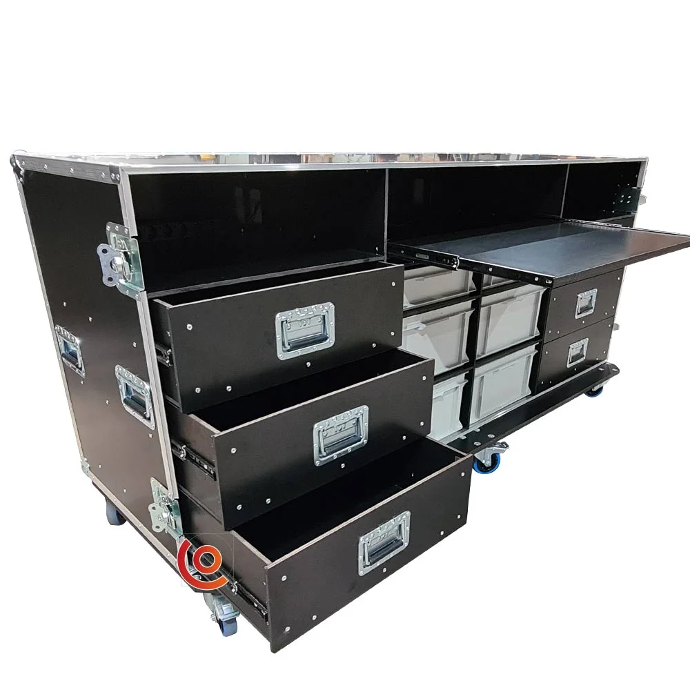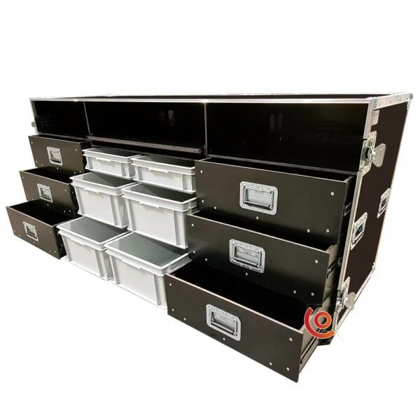 Le flight case est équipé de 6 tiroirs sur glissière 550 x 500 x 190 mm et d’une tablette de 800 x 500 x 18 mm.