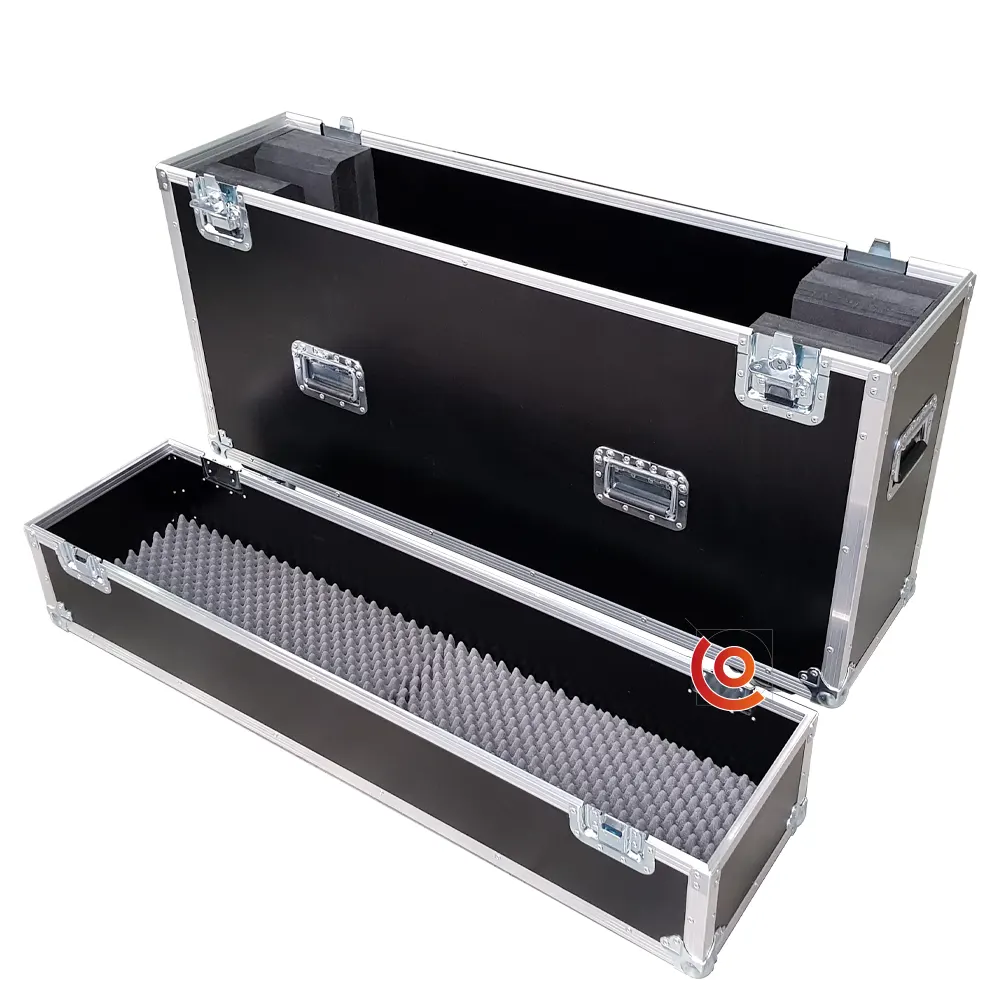 Flight case professionnel pour écran 70 pouces, fabriqué en contreplaqué bouleau 9 mm, avec mousse Plastazote haute densité pour absorber les chocs et vibrations. Options : couleur, coins, fermoirs cadenassables, roulettes, finition All Black. Fabrication française qualité premium.