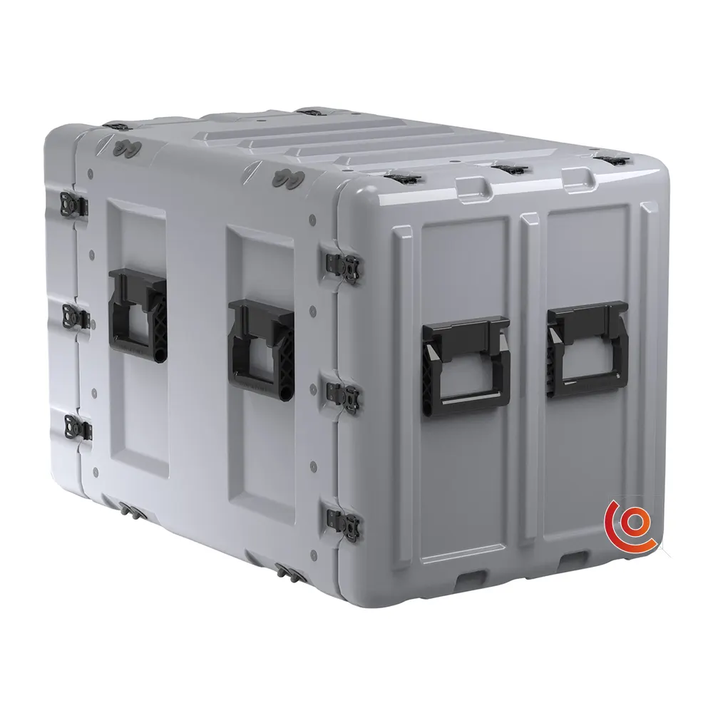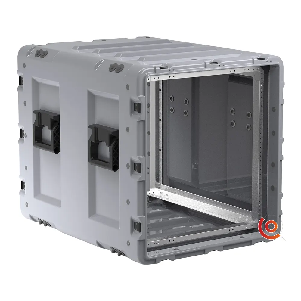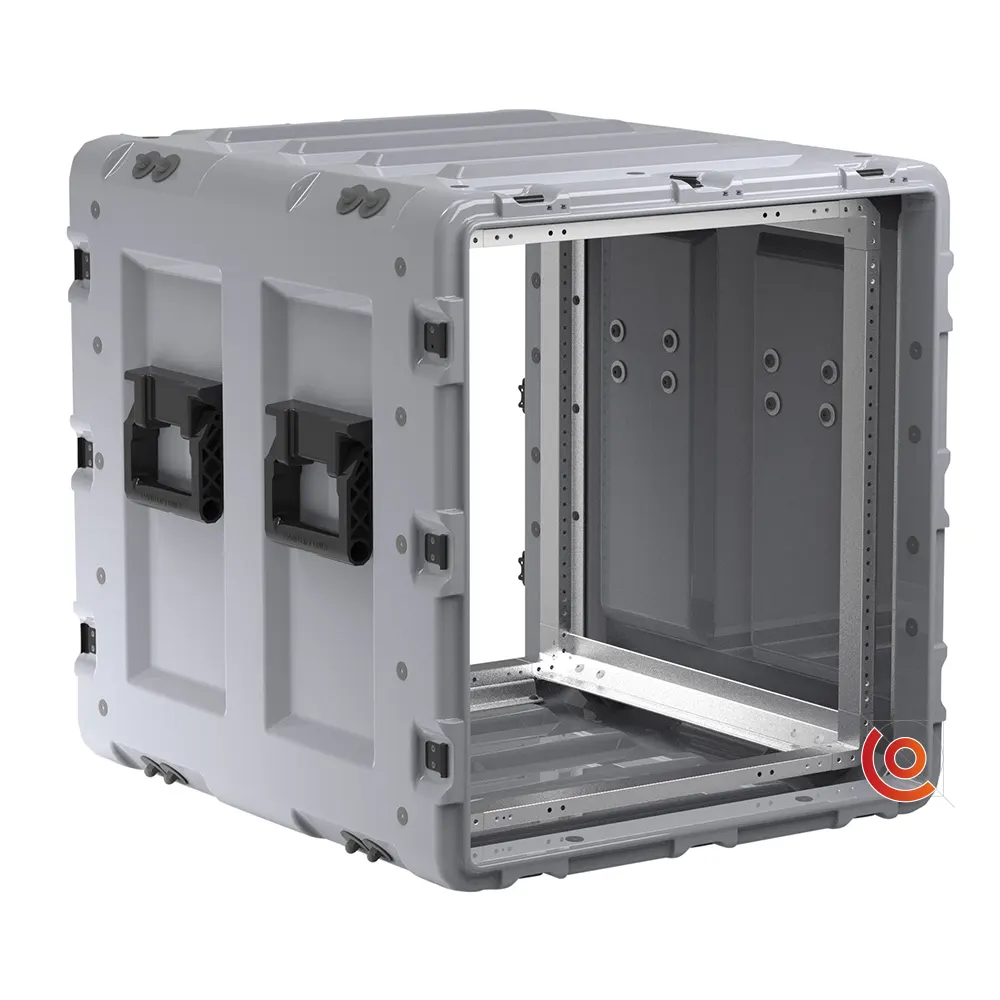 Conteneur rotomoulé texturé discret doté d’un rack conforme à la norme EIA de 48,26 cm de large et de 50,8 cm ou de 60,96 cm de profondeur.